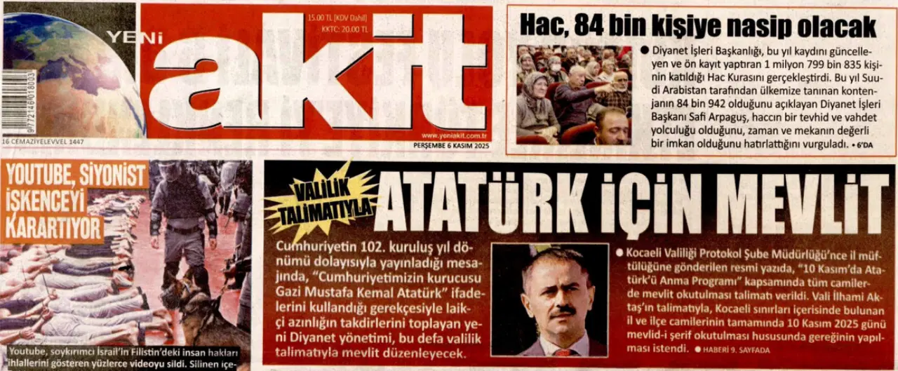 Gazete, Diyanet İşleri Başkanlığı’nı kuran Mustafa Kemal Atatürk’ün adına dua okunmasını, “Valilik talimatıyla Atatürk için mevlit” başlığı ile hedef aldı.